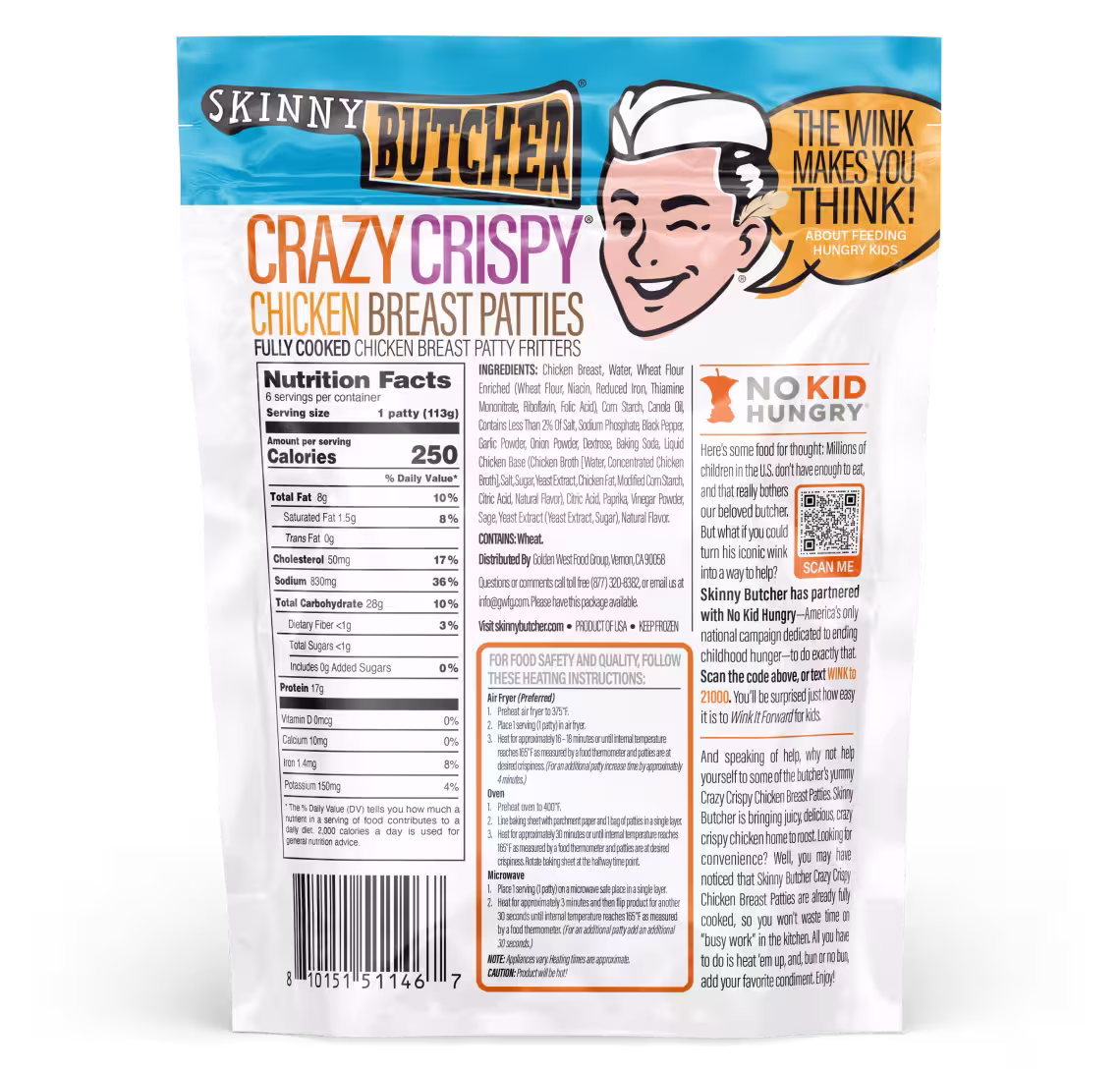From the farm to your freezer, Skinny Butcher Crazy Crispy® Chicken Breast Patties make meals crazy easy and crazy delicious. The Butcher's double-breaded chicken patties are so irresistibly crispy, you’ll forget they were ever frozen! Made from 100% Grade A chicken, free from fillers or preservatives, Skinny Butcher’s Crazy Crispy® Chicken Breast Patties bring premium taste, quality, and that perfect crunch to your table in a matter of minutes.